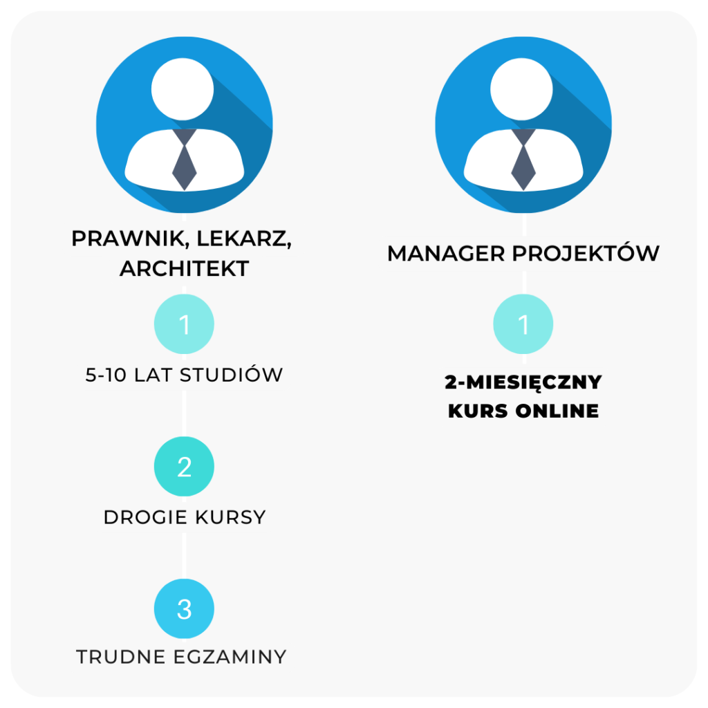A teraz pomyśl o zawodzie Managera Projektów IT. Zarobki zbliżone, a nawet wyższe na starcie. Ale zamiast 5-10 lat nauki masz kilka miesięcy. To chyba łatwy start, prawda?
