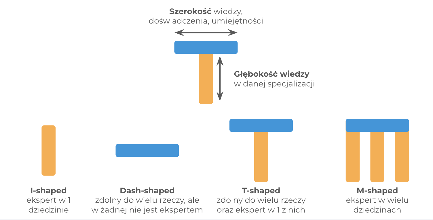 Dodatkowo taką osobą najłatwiej jest zostać, bo potrzebujemy zaledwie 1 specjalizacji oraz podstawowej wiedzy z innych obszarów. Jesteśmy także bardziej odporni na zmiany rynkowe, bo łatwiej jest nam zmienić specjalizację, aby lepiej wpasować się w potrzeby organizacji.