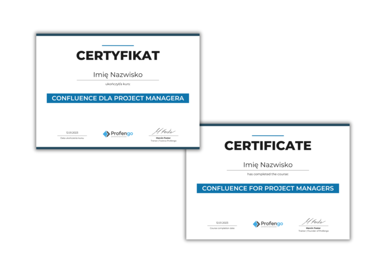 Certyfikat otrzymasz od razu po ukończeniu kursu “Zarządzanie projektami IT”. Otrzymasz go w formie elektronicznej więc nie musisz czekać, aż ktoś Ci go wyśle i zanim poczta go dostarczy.