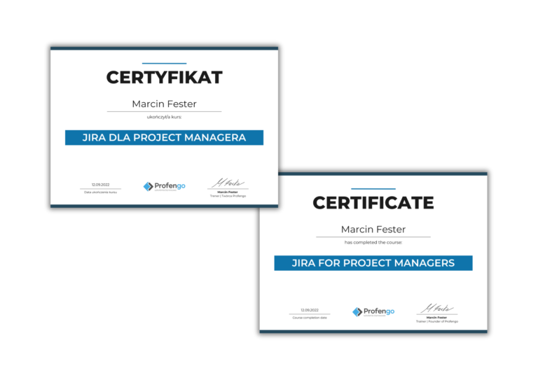 Certyfikat otrzymasz od razu po ukończeniu kursu “Zarządzanie projektami IT”. Otrzymasz go w formie elektronicznej więc nie musisz czekać, aż ktoś Ci go wyśle i zanim poczta go dostarczy.