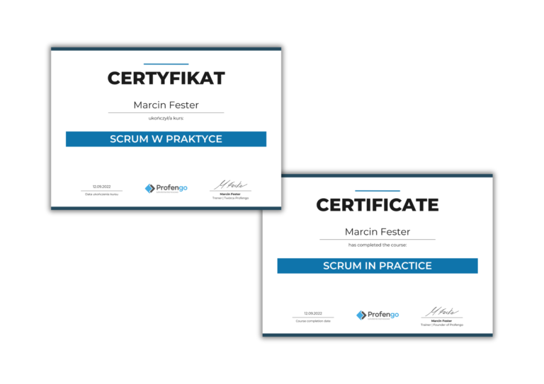 Tak, po ukończeniu każdego kursu otrzymasz oddzielne certyfikaty w wersji po polsku i angielsku. To pokaże Twojemu pracodawcy, że cały czas się rozwijasz w tej roli.