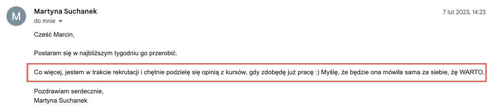 Później na bieżąco analizujemy feedback, który zbierzesz po wysłaniu aplikacji do firm i na rozmowach rekrutacyjnych. Na tej podstawie dokonujemy kolejnych poprawek.